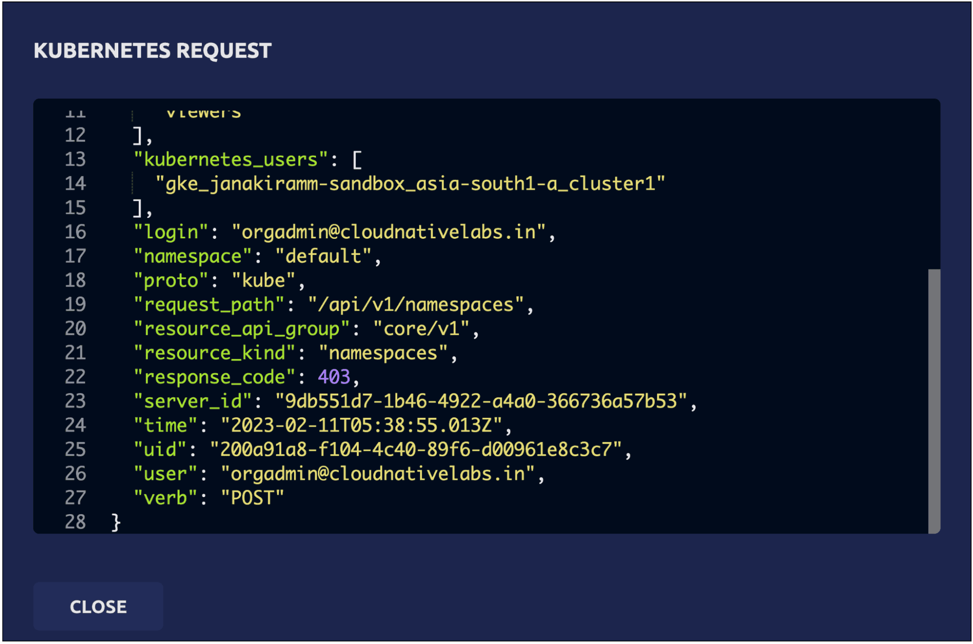 The details clearly explain that a POST request has been made to the Kubernetes API server attempting to create the namespace, which was declined.