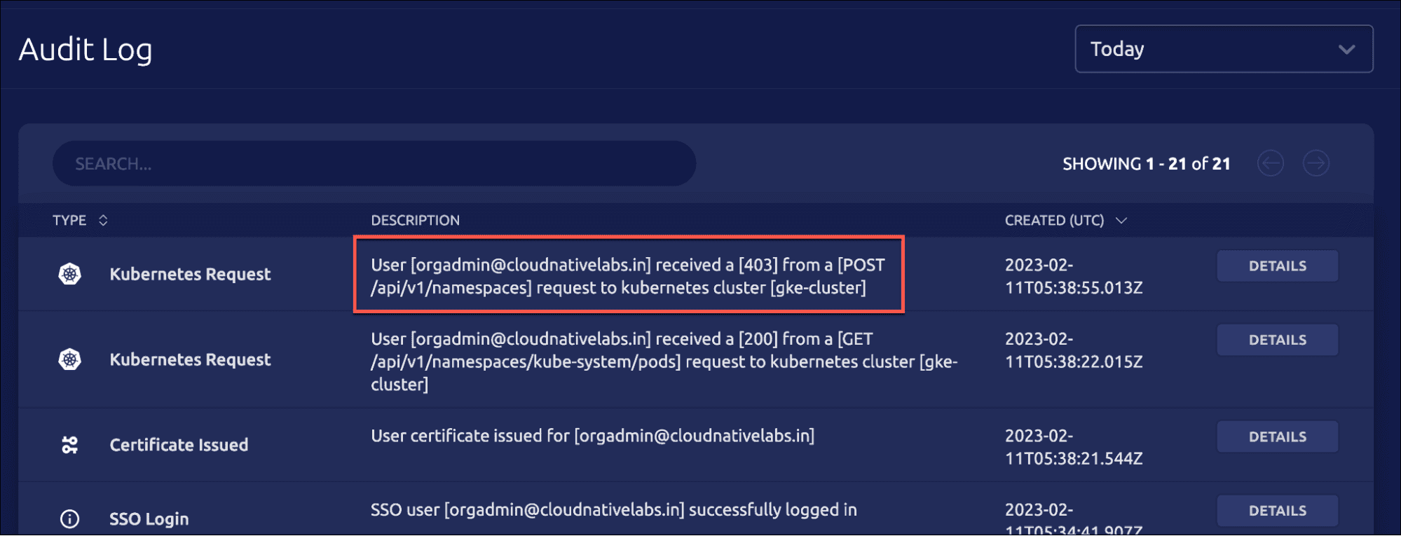 Since the action violates the access policy defined by the RBAC, it is also visible in Teleport audit logs, and any kubectl execs are recorded.