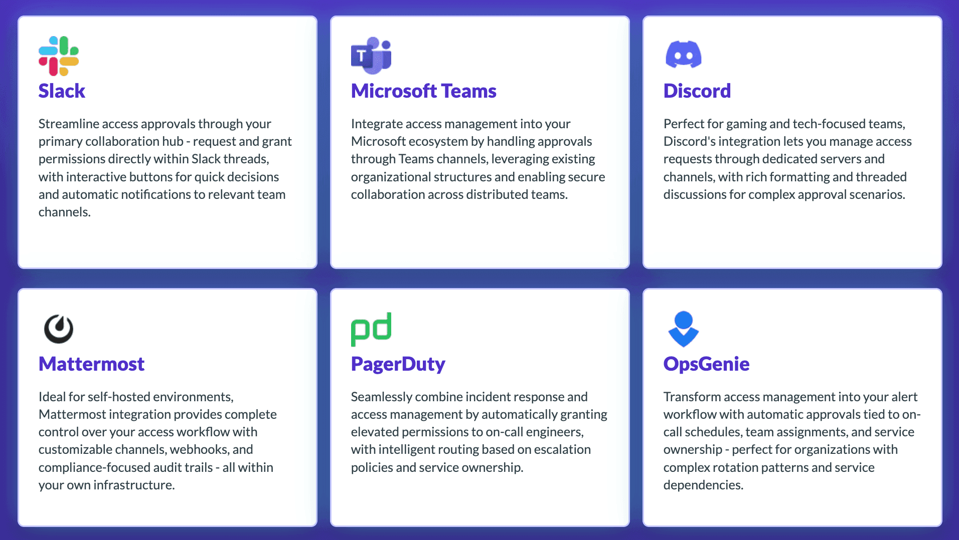 Approve or deny just-in-time access requests via ChatOps, Slack, PagerDuty – or, set up automated approval workflows based on context such as role, device or time.