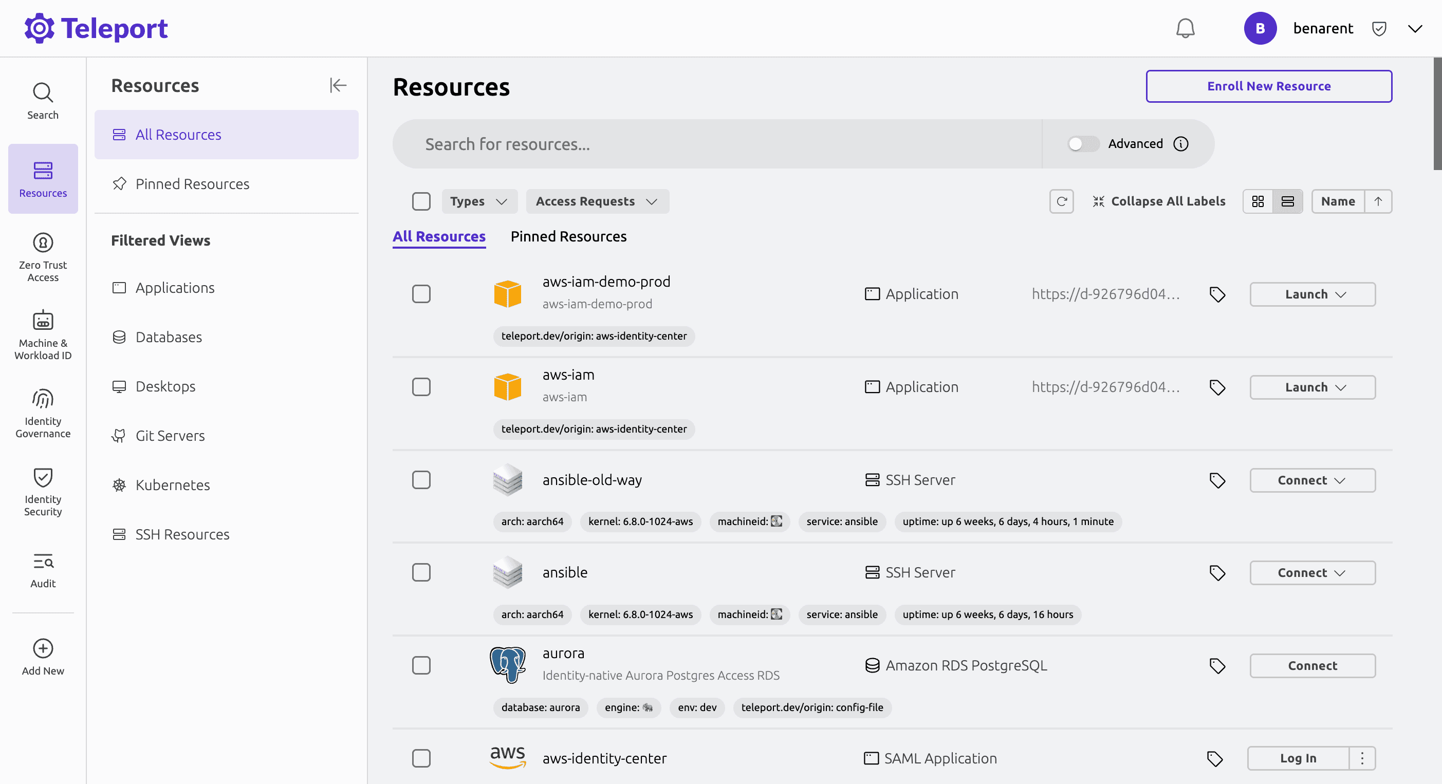 View dynamic catalog of available infrastructure identities—servers, Kubernetes clusters, databases, web applications, and more.