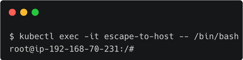 John deploys the pod into the default namespace and then executes the bash command within the container, which drops him straight into the host shell.