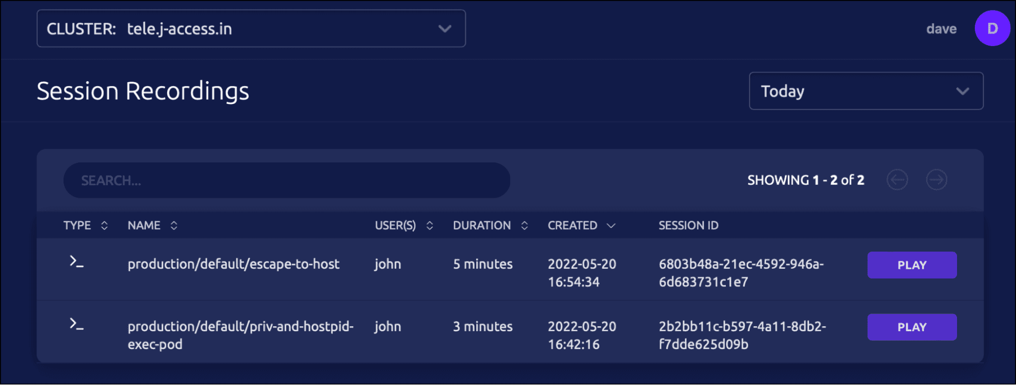 Dave now wants to access the recording of the last kubectl session initiated by John to identify the problem.