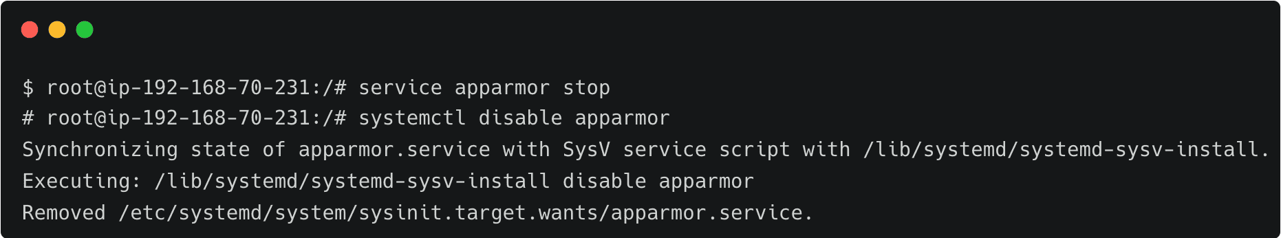 Gaining the root access to the host, John deliberately disables the Apparmor Linux security module, designed to implement mandatory access control (MAC) policies. This step, which is not expected to be performed on production servers, leads to a security risk.