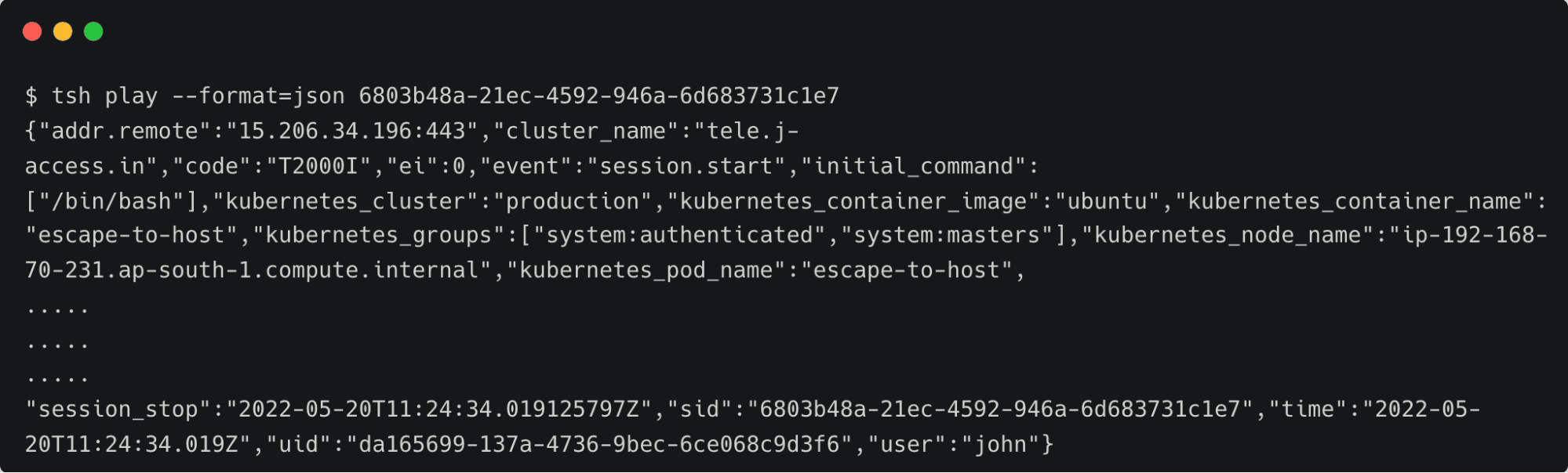 It’s also possible to print the session events in JSON to the terminal by adding the –format=json switch.