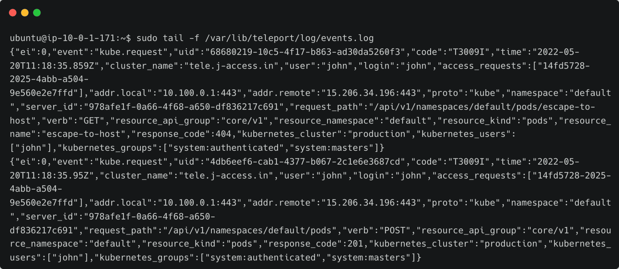sudo tail -f /var/lib/teleport/log/events.log