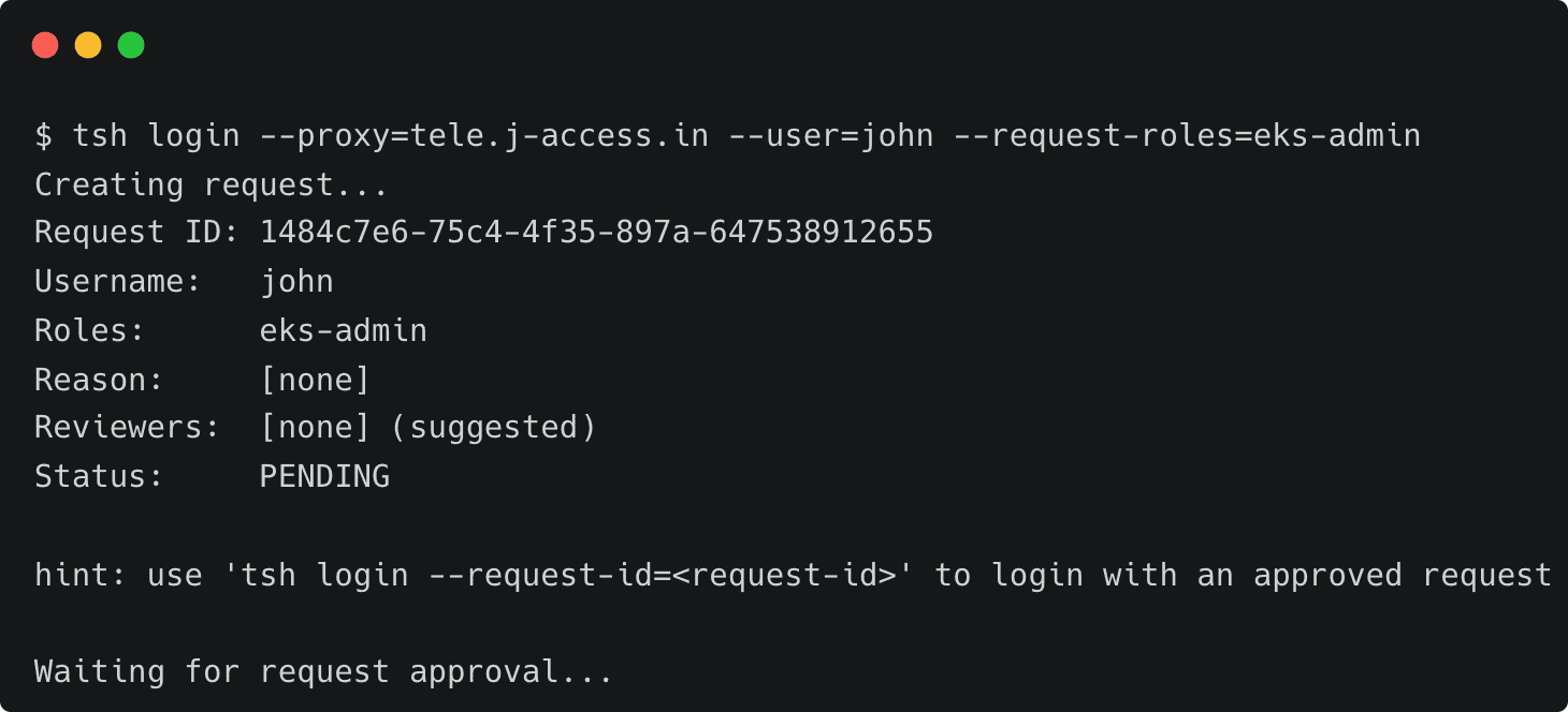 tsh login --proxy=tele.j-access.in --user=john --request-roles=eks-admin
