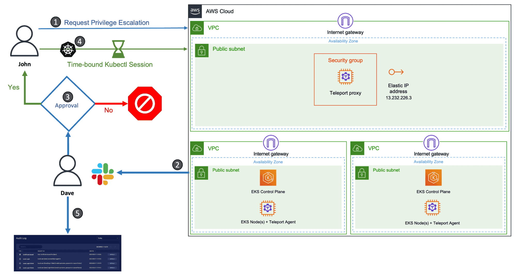 Once Dave approves the request, John assumes the role of an EKS administrator for 60 minutes.